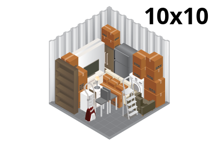 A 10×10 space is perfect for storing the contents of an entire living room, a one-bedroom apartment with major appliances, or other furniture and supplies. Approximately the size of a standard bedroom.