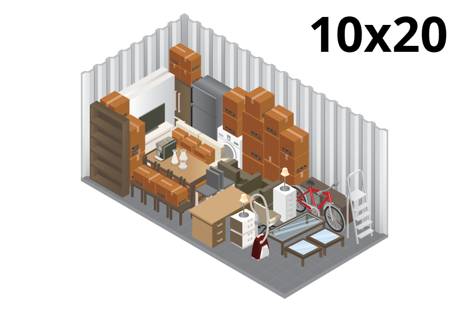 A 10×20 storage unit is approximately the size of a standard one-car garage. With 200 sq. ft. of storage space you can store a three- to four-bedroom house while you’re in-between homes. Or, you can store all your business files and inventory. A 10×20 space is perfect for multiple storage racks.