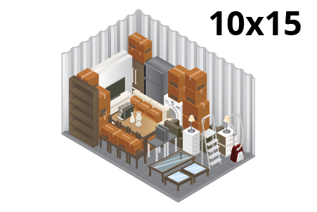 This 150 sq. ft. storage space can hold the contents of up to three bedrooms. It’s the ideal space for larger items including major appliances, boxes, miscellaneous items, and business inventory. A 10×15 storage unit is approximately the size of a standard living room.